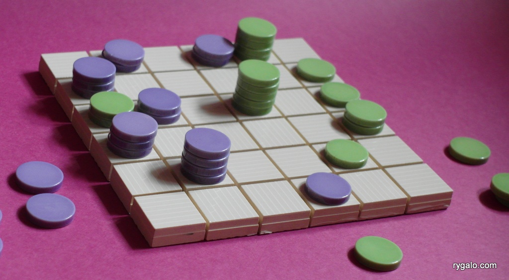 Martin Windischer stworzył tę prostą, ale wciągającą grę stosunkowo niedawno, bo w 2003 roku. Akcesoria oczywiście mało kłopotliwe: plansza 6×6 i po 24 piony dla każdego gracza. Powinny one dać się ustawiać w wieże, więc polecam zwykłe warcabowe piony. Przed rozpoczęciem rozgrywki 12 pionów każdego z graczy znajduje się na planszy w pierwszym i drugim rzędzie planszy.