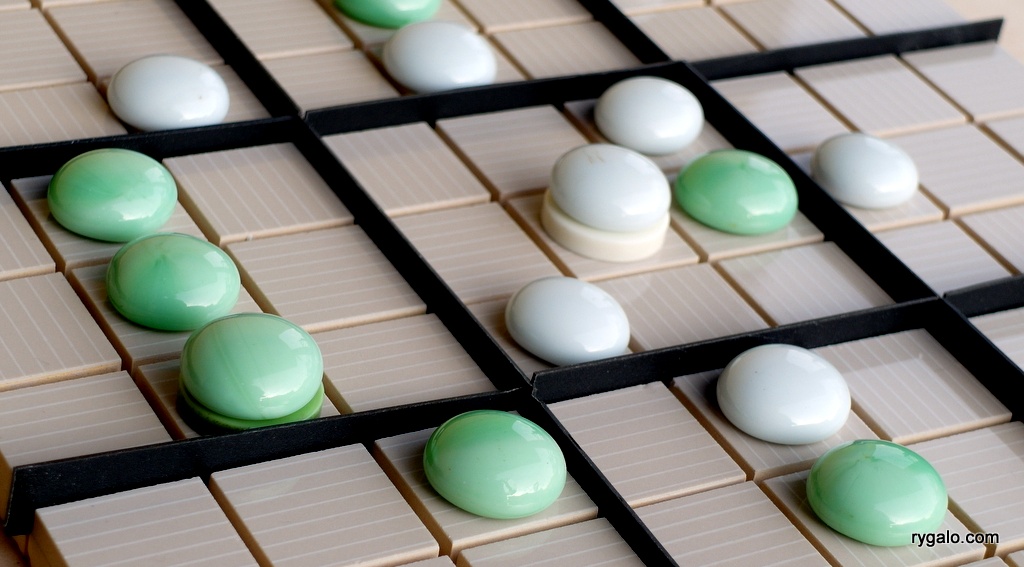 Wśród wyróżnionych kilka lat temu przez Mensa gier planszowych znalazła się jedna, która zdawała się budzić kontrowersje… Plansza jak do Sudoku – 9 kwadratowych obszarów, każdy z nich zawiera 9 pól, kilkadziesiąt pionów w dwóch kolorach, kilka znaczników w formie kółek i… gramy! Przeciwnicy na zmianę stawiają swoje piony na pustej początkowo planszy, dążąc do tworzenia na kolejnych obszarach planszy linii z trzech swoich pionów. Kółko i krzyżyk?! ZNOWU?!Oczywiście chciałem przyoszczędzić i usiłowałem sobie przypomnieć, w którym lumpexie widziałem ostatnio drewnianą planszę do Sudoku, ale nic z tego nie wyszło – zmontowałem sobie samoróbkę. Średnio estetyczna, ale działa…