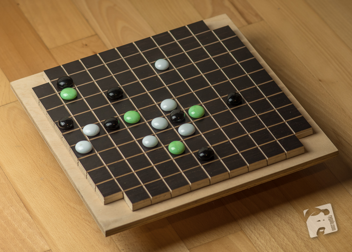 O masz… Znowu jakaś dziwaczna plansza! I trzy kolory pionów?! Kto to wymyślił?! G. Keith Still, w 1979 roku… I całe szczęście! Wprawdzie gra wymaga sporej uwagi, gdyż łatwo przegapić swoje własne zwycięstwo, oraz nieco wysiłku przy tworzeniu planszy i kompletowaniu pionów, ale zabawa w pełni te wysiłki rekompensuje… Do dzieła – potrzebna jest plansza 11×11 pozbawiona pól narożnych, po dwadzieścia pionów w dwóch kolorach dla każdego z graczy (Still nazywa je quadami) oraz po sześć pionów neutralnych dla każdego z nich (quasary) – u mnie są to zielone kamienie.