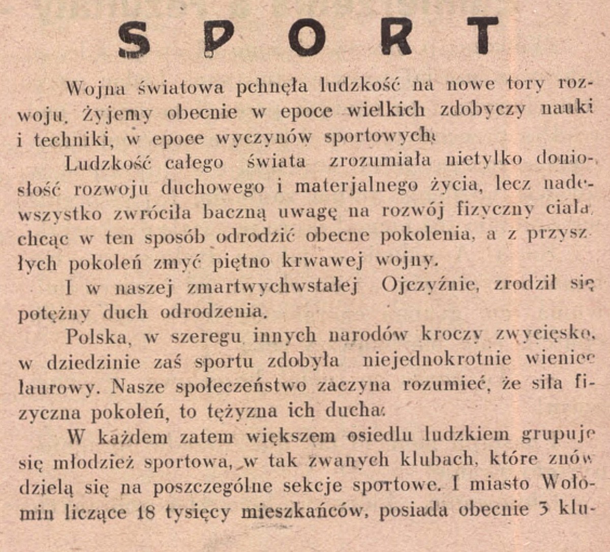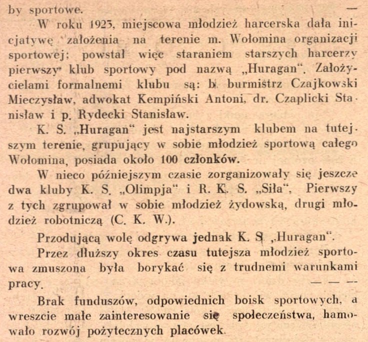 W roku 1923, miejscowa młodzież harcerska dała inicjatywę założenia na terenie m. Wołomina organizacji sportowej; powstał więc staraniem starszych harcerzy pierwszy klub sportowy pod nazwą „Huragan”. Założycielami formalnemi klubu są: b. burmistrz Czajkowski Mieczysław, adwokat Kempiński Antoni, dr. Czaplicki Stanisław i p. Rydecki Stanisław.