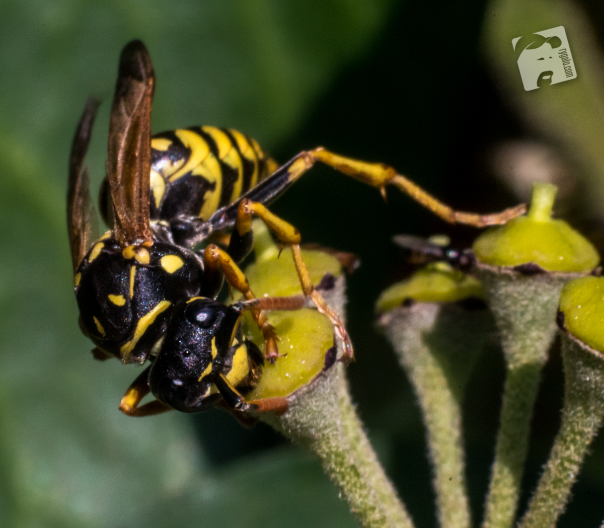 Kwiaty bluszczu nie pachną dla nas jakoś szczególnie pięknie – czuć je raczej padliną, dlatego wabią głównie muchy i… osy. Nie miałem w tym roku zbyt wielu okazji do podpatrywania owadów, więc muszę się cieszyć choć tym.