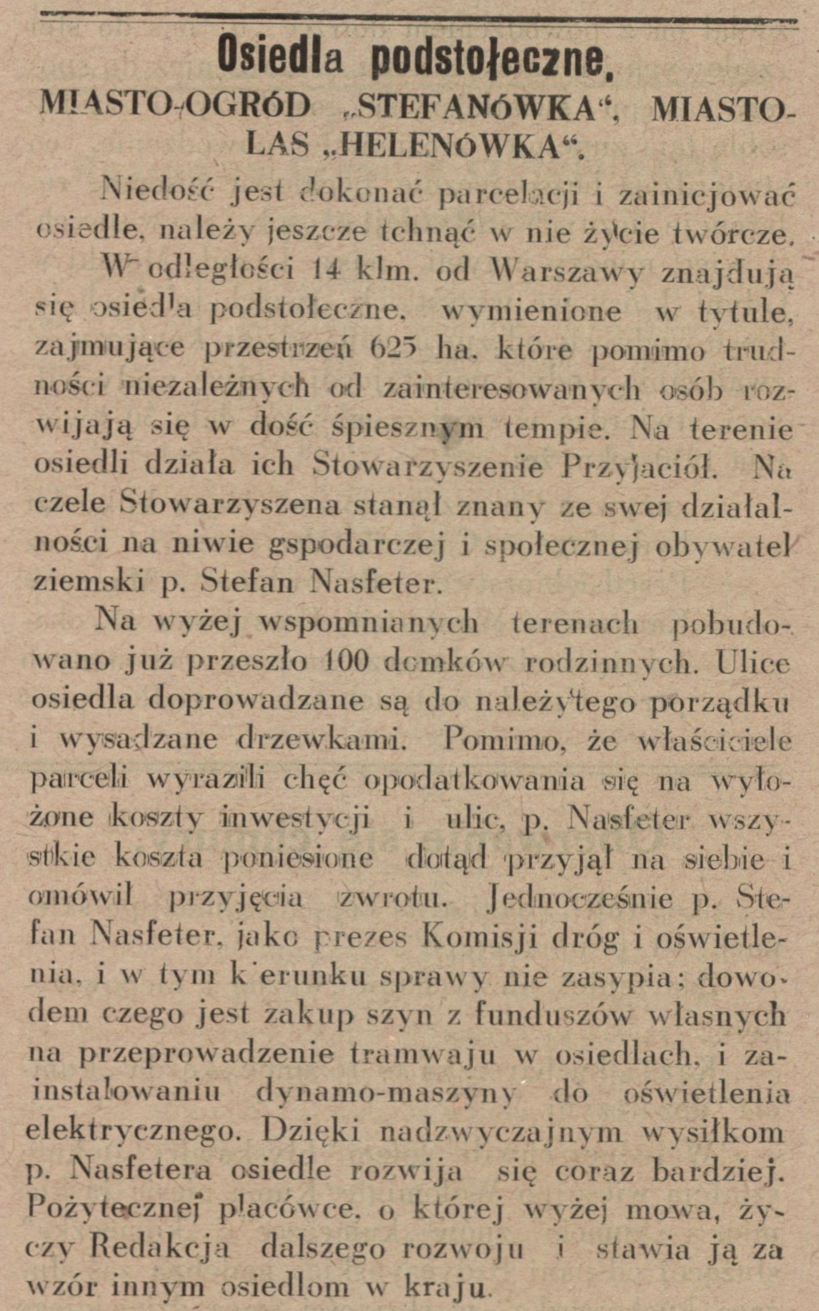 W latach trzydziestych Helenówka i Stefanówka nie były jeszcze cześcią Wołomina i Kobyłki i zapewne nikt wówczas nie podejrzewał, że do tego kiedyś dojdzie. Mocno zaintrygował mnie fragment o zakupie szyn tramwajowych przez Nasfetera – słyszałem już gdzieś o tym, że linia tramwajowa do Zenonowa nie była jedyną, ale na planie miasta z 1933 roku jest tylko ona…