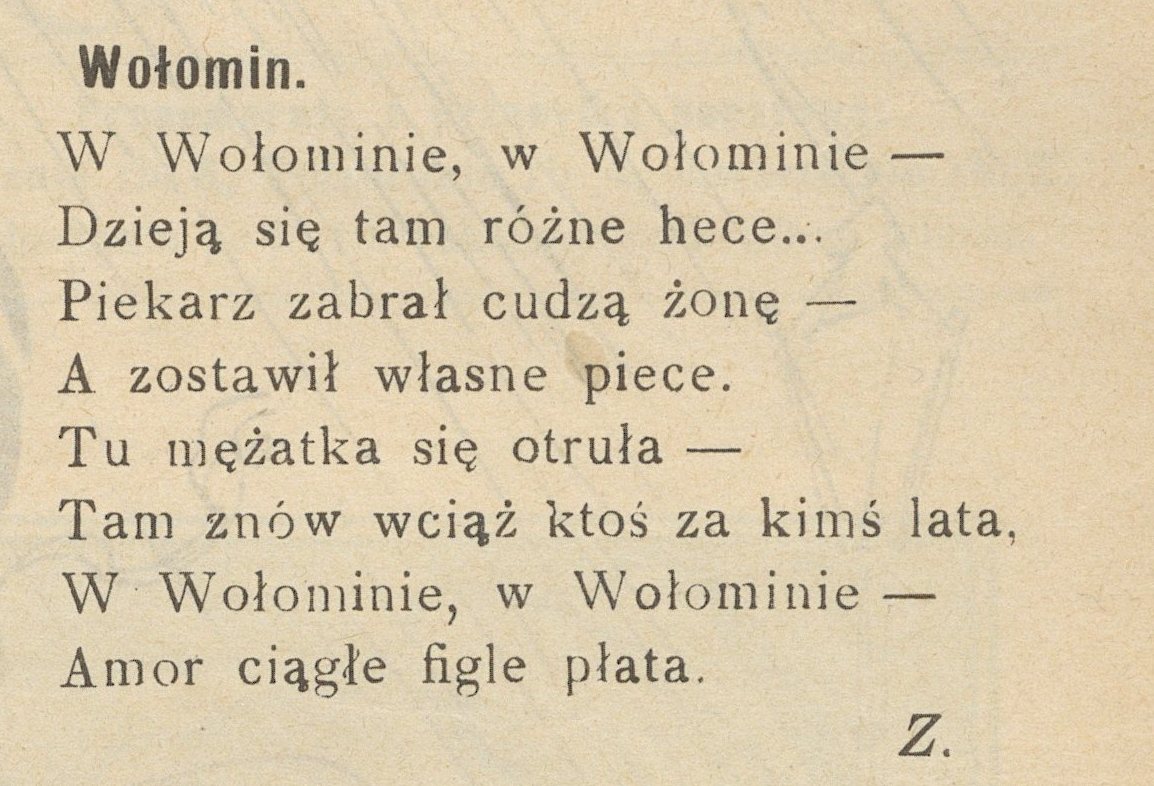 Nie wiem, co takiego wydarzyło się w 1909 roku w Wołominie, że aż uwieczniono to w wątpliwej jakości poezji publikowanej w humorystycznych tygodnikach, ale musiało to być naprawdę gorące lato… Pewnie takie, jak tegoroczne.