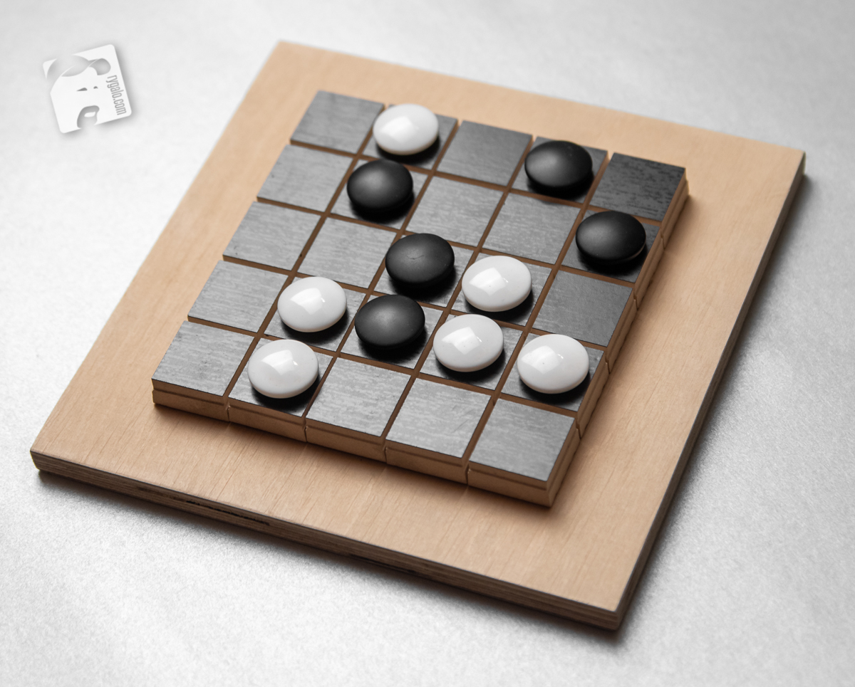 Sytuacja na obrazku: grający białymi właśnie postawił swojego piona w ostatnim, najwyższym rzędzie – i wygrał. Czarny nie może przerwać tworzonej właśnie, ukośnej linii – utworzy w ten sposób linię z trzech własnych pionów.