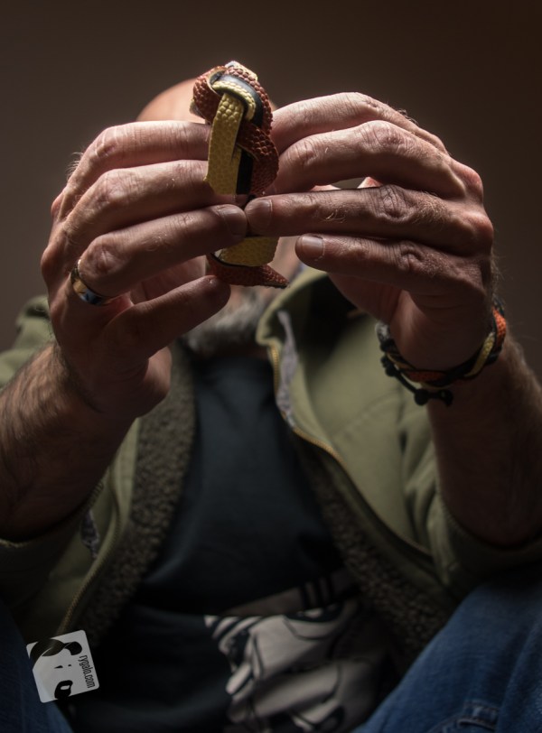 Najpierw miałem pomysł, żeby ze starej piłki do koszykówki zrobić koronę… W końcu Skuzia funkcjonowała przez jakiś czas w drużynie jako „królowa osobistych”, więc takie przechodnie trofeum mogłoby się sprawdzić, ale efekt mojej pracy nie był zachwycający. Zacząłem kombinować ze ścinkami i uplotłem coś na kształt bransoletki. Chyba przestanę się śmiać z tych wszystkich domowych rękodzielników… To relaksujące zajęcie!