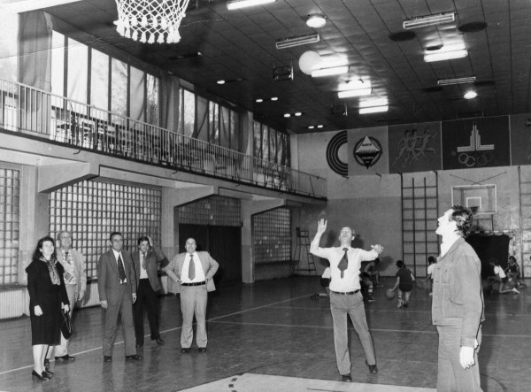 Bez trybun, za to z balkonem do końca i słynnymi luksferami oraz nieszczelnymi drzwiami, sufit jeszcze bez świetlika i niski. W tle trenują koszykarki, więc pewnie po 1978 roku. Nad koszem coś jakby logo olimpiady w Moskwie, wiec i po 1980. Więcej nie jestem w stanie się domyślić, a o rozpoznaniu krawaciarzy z pierwszego planu nawet nie ma mowy.