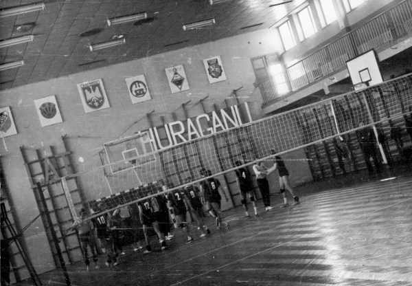 No właśnie – ile lat? Zdjęcie krzywe i złachane, ale parę rzeczy widać: że Huragan Wołomin, że przed przebudową hali. Drzwi ewakuacyjne z balkonu częściowo przeszklone. Na ścianie emblematy Ursusa (?), LZS, Mazowsza, Szkolnego Związku Sportowego, KS Kolejarz Huragan i KS Pogoń Siedlce. Co to za impreza? Który rok? Kolejna zagadka „z archiwum W”.